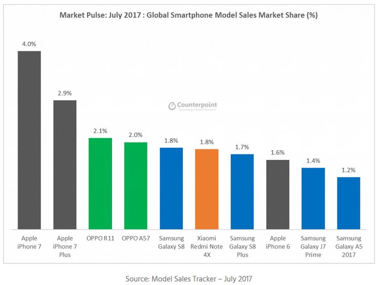 Es impresionante el avance de China en el mercado, pero en contrapartida los modelos de smartphones siguen teniendo como líder a la empresa de la manzanita con tres modelos, y a sólo unos días del lanzamiento del nuevo iPhone.